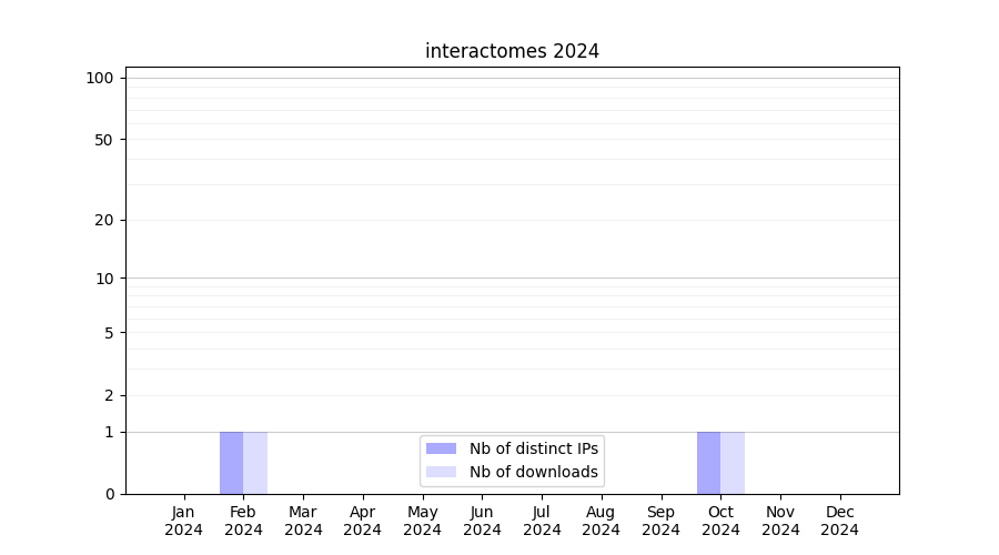 Number of downloads for annotation package interactomes, year by year, from 2025 back to 2014 (years with no downloads are omitted):