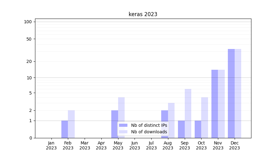 Number of downloads for annotation package keras, year by year, from 2025 back to 2014 (years with no downloads are omitted):