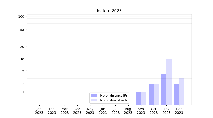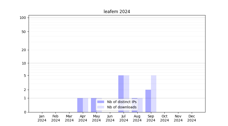 Number of downloads for annotation package leafem, year by year, from 2025 back to 2014 (years with no downloads are omitted):
