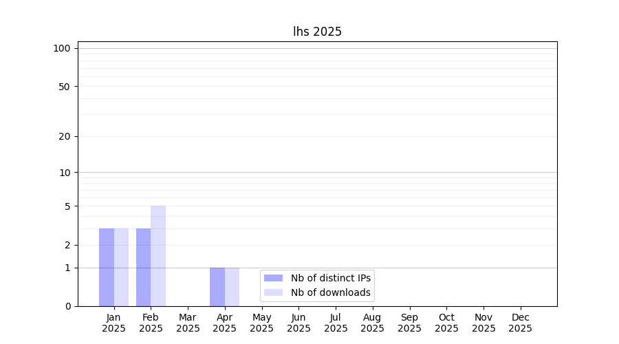 Number of downloads for annotation package lhs, year by year, from 2025 back to 2014 (years with no downloads are omitted):