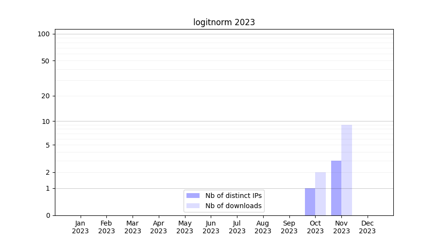 Number of downloads for annotation package logitnorm, year by year, from 2025 back to 2014 (years with no downloads are omitted):