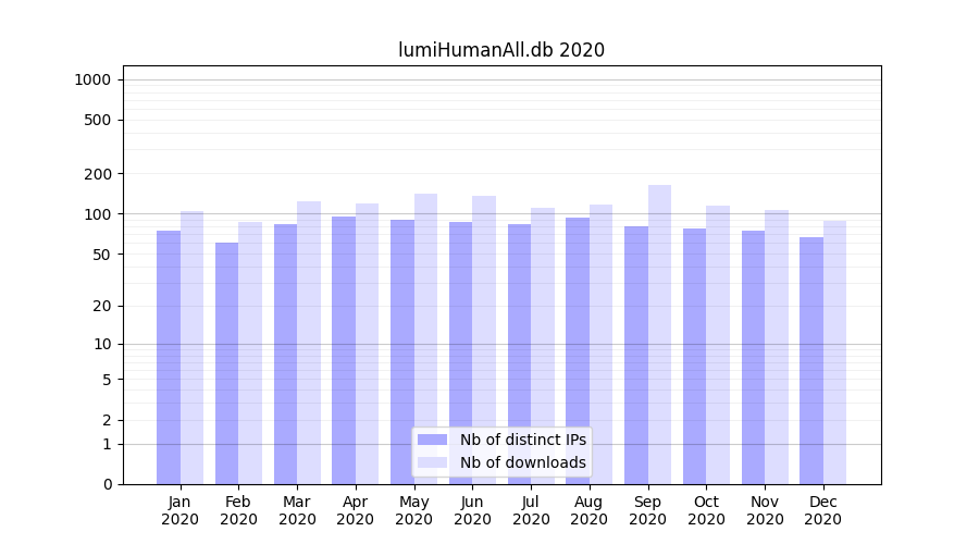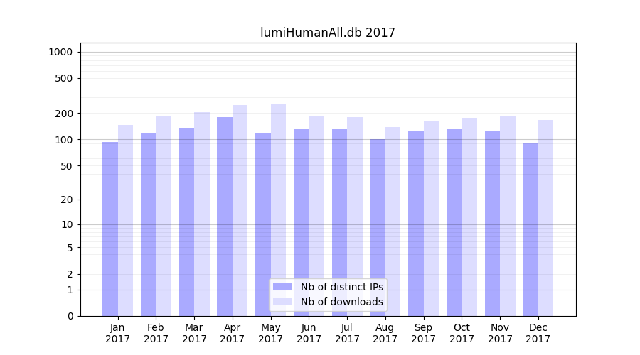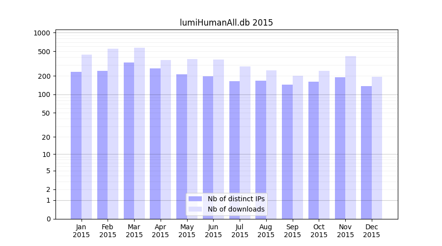 Number of downloads for annotation package lumiHumanAll.db, year by year, from 2025 back to 2014 (years with no downloads are omitted):