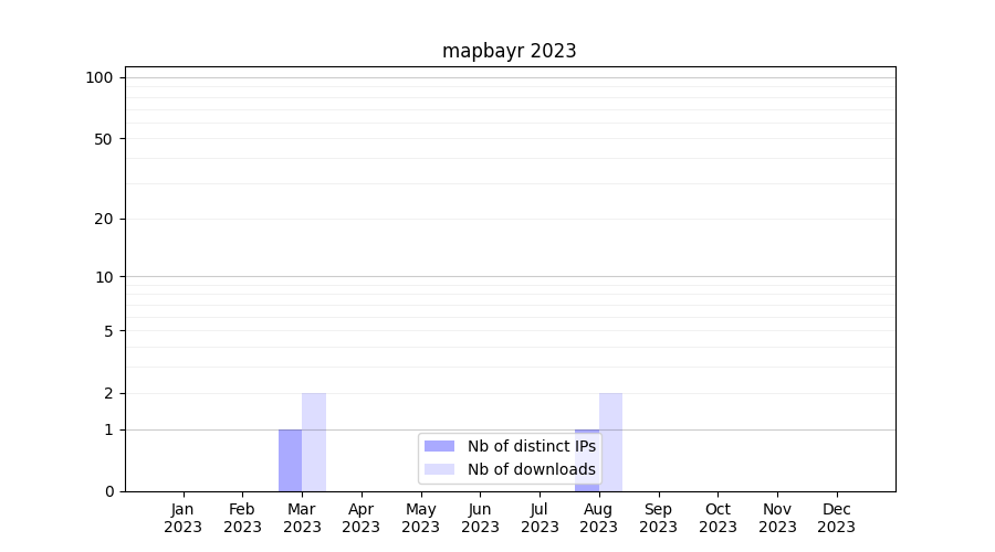 Number of downloads for annotation package mapbayr, year by year, from 2025 back to 2014 (years with no downloads are omitted):