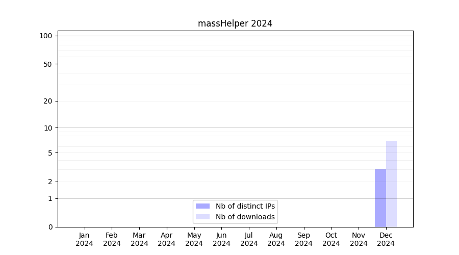Number of downloads for annotation package massHelper, year by year, from 2025 back to 2014 (years with no downloads are omitted):