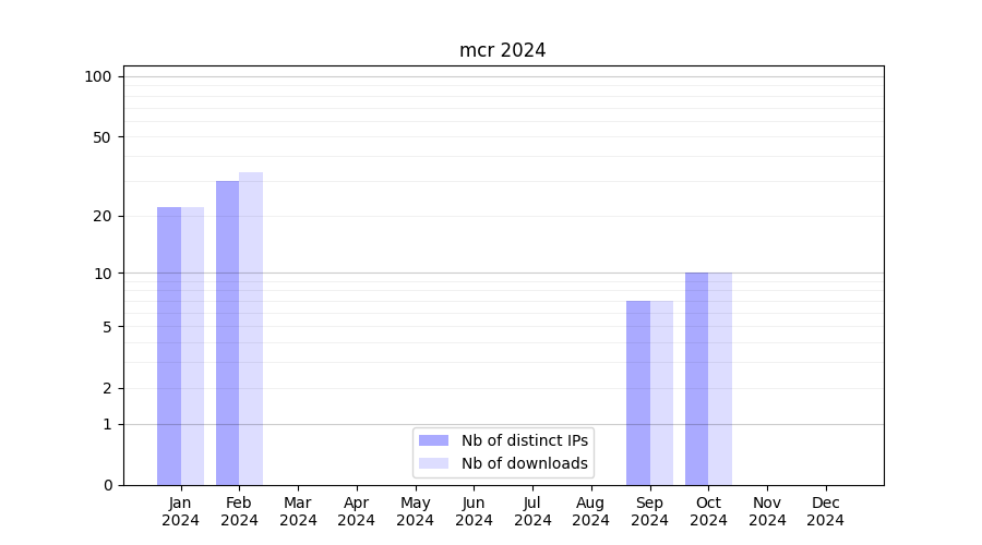 Number of downloads for annotation package mcr, year by year, from 2025 back to 2014 (years with no downloads are omitted):