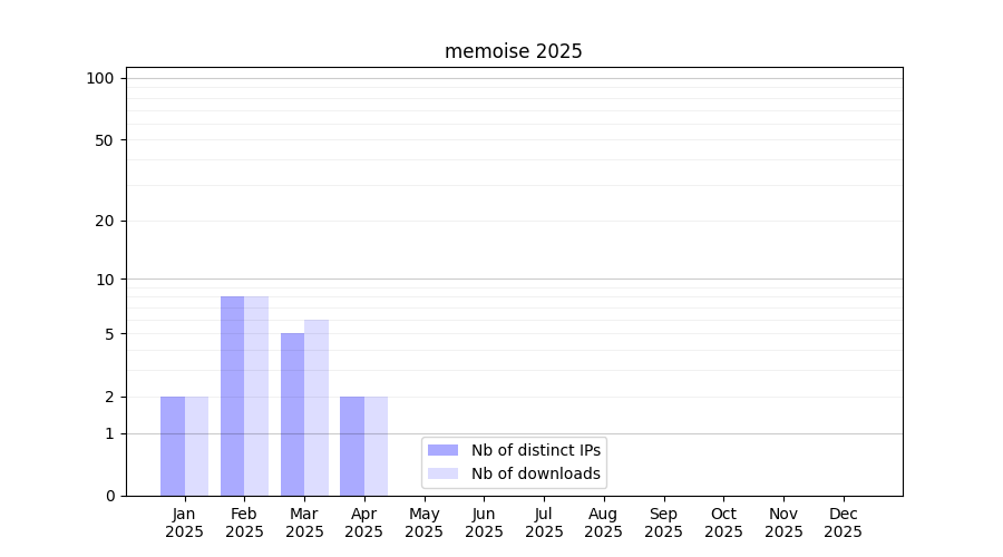 Number of downloads for annotation package memoise, year by year, from 2025 back to 2014 (years with no downloads are omitted):