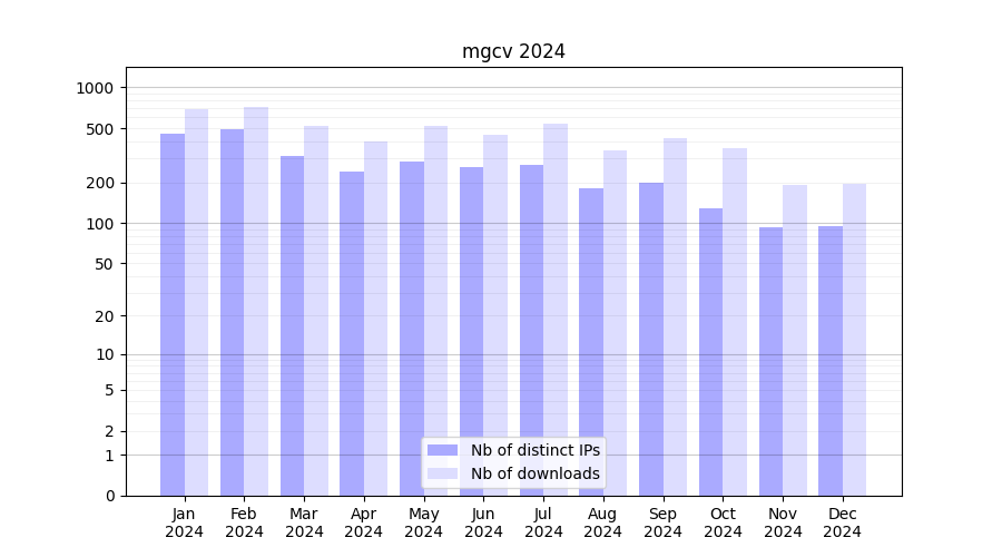 Number of downloads for annotation package mgcv, year by year, from 2025 back to 2014 (years with no downloads are omitted):