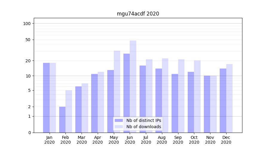 Number of downloads for annotation package mgu74acdf, year by year, from 2025 back to 2014 (years with no downloads are omitted):