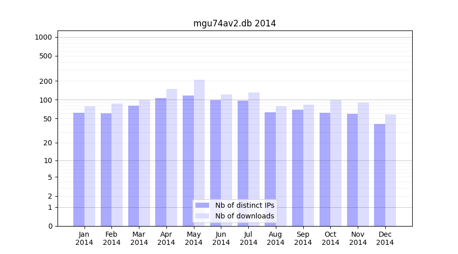 Number of downloads for annotation package mgu74av2.db, year by year, from 2025 back to 2014 (years with no downloads are omitted):