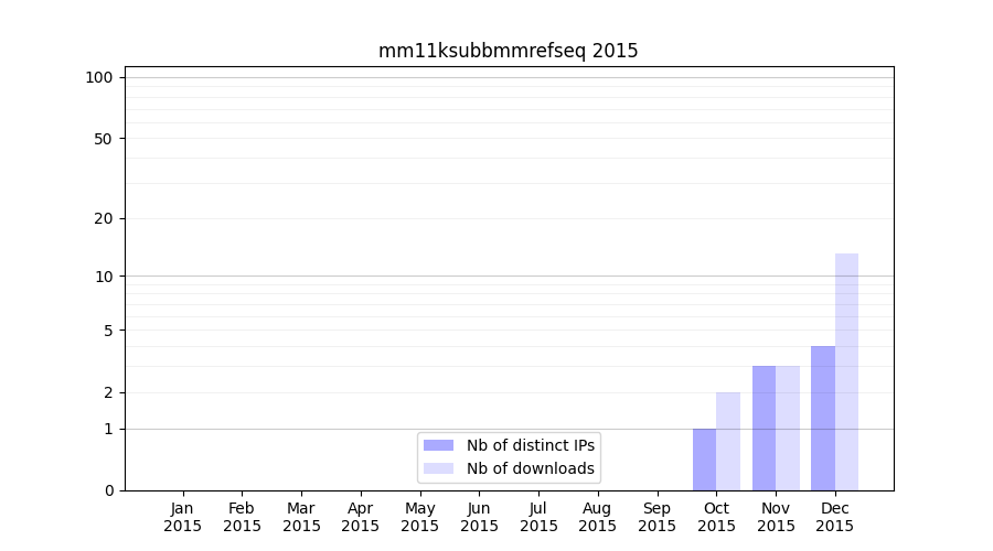 Number of downloads for annotation package mm11ksubbmmrefseq, year by year, from 2025 back to 2014 (years with no downloads are omitted):