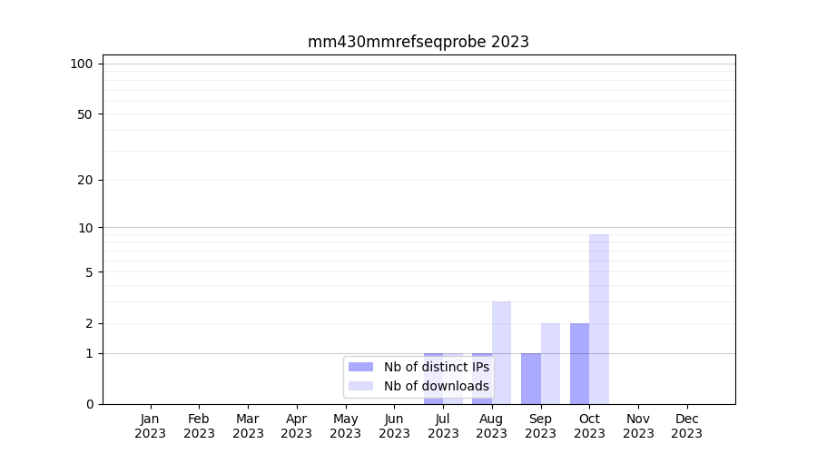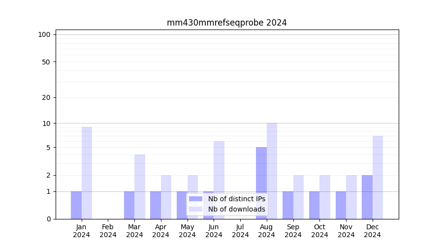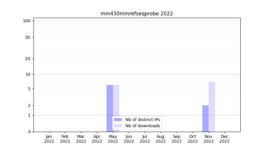 Number of downloads for annotation package mm430mmrefseqprobe, year by year, from 2025 back to 2014 (years with no downloads are omitted):