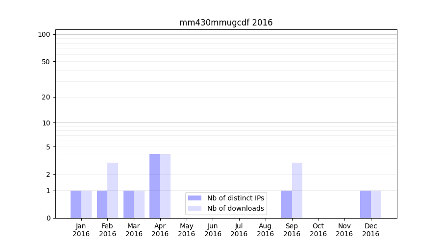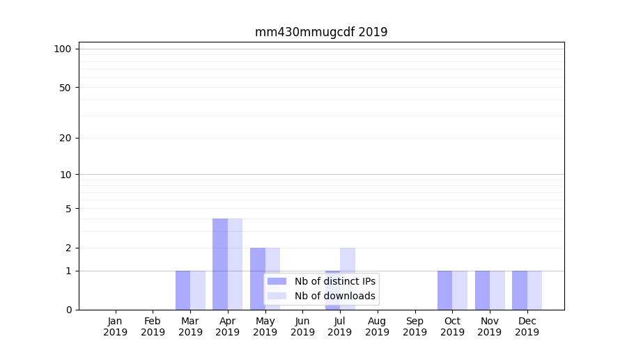 Number of downloads for annotation package mm430mmugcdf, year by year, from 2025 back to 2014 (years with no downloads are omitted):