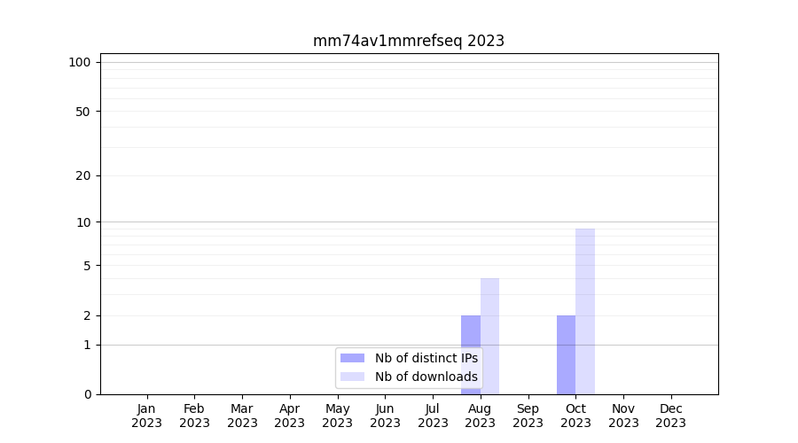 Number of downloads for annotation package mm74av1mmrefseq, year by year, from 2025 back to 2014 (years with no downloads are omitted):