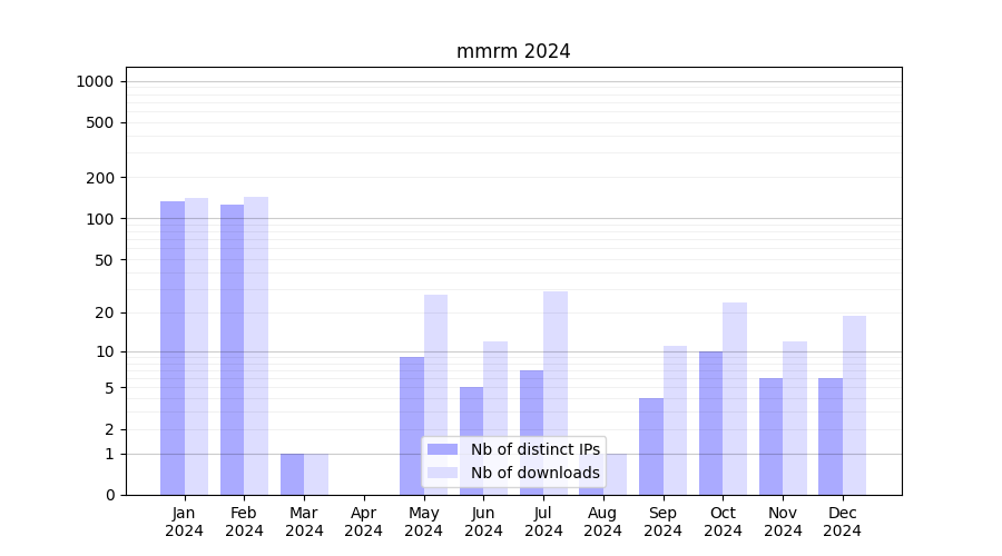 Number of downloads for annotation package mmrm, year by year, from 2025 back to 2014 (years with no downloads are omitted):