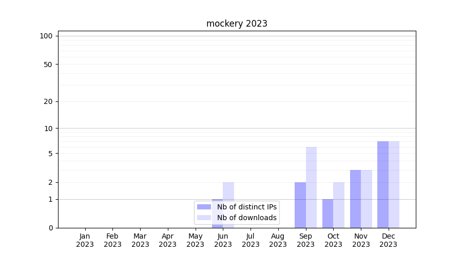 Number of downloads for annotation package mockery, year by year, from 2025 back to 2014 (years with no downloads are omitted):