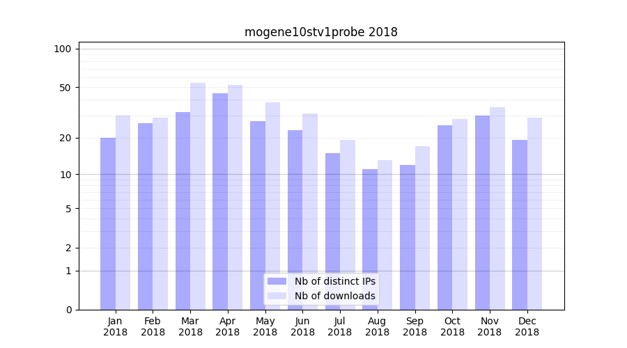 Number of downloads for annotation package mogene10stv1probe, year by year, from 2025 back to 2014 (years with no downloads are omitted):