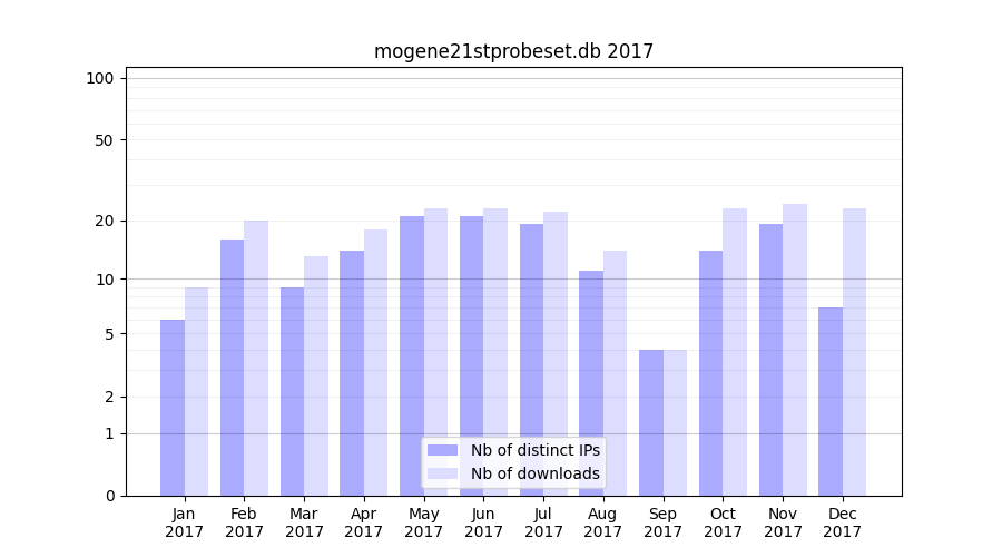 Number of downloads for annotation package mogene21stprobeset.db, year by year, from 2025 back to 2014 (years with no downloads are omitted):