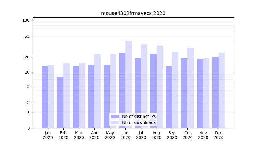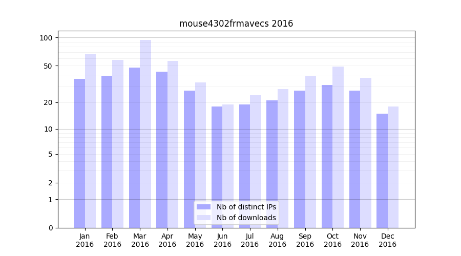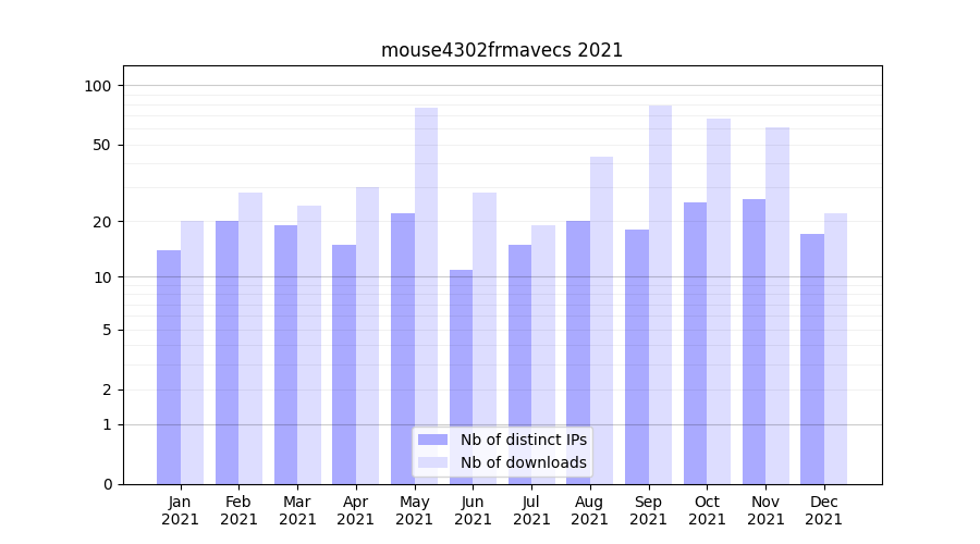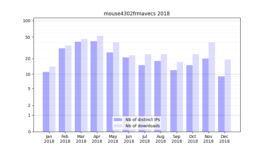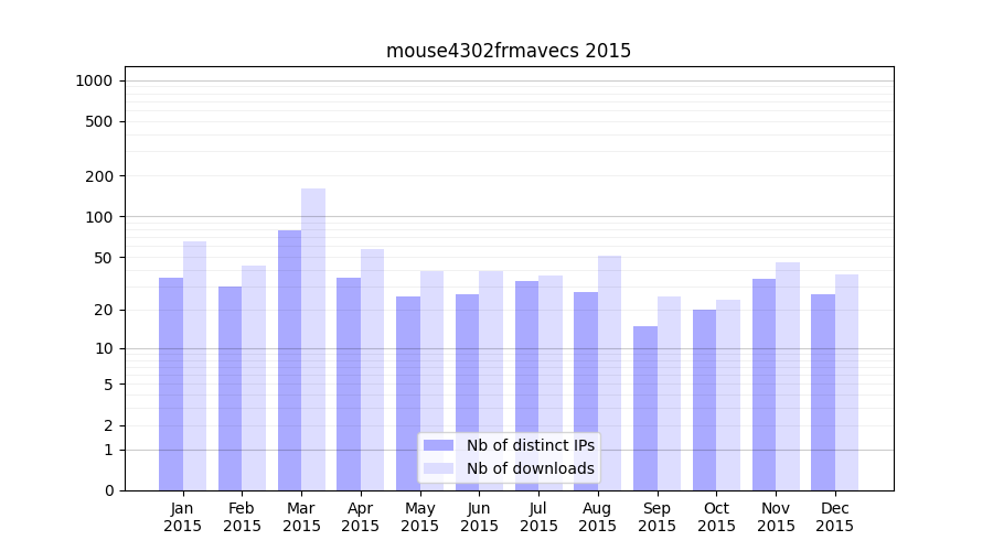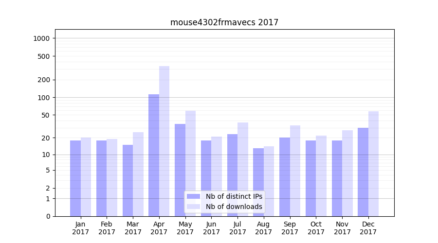 Number of downloads for annotation package mouse4302frmavecs, year by year, from 2025 back to 2014 (years with no downloads are omitted):