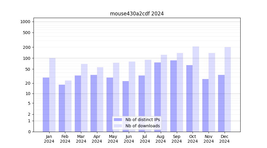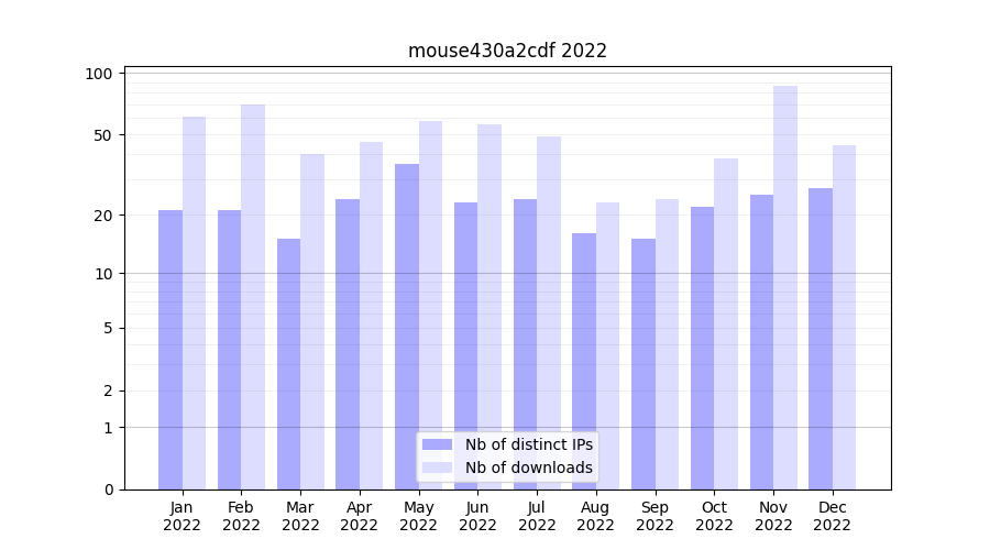 Number of downloads for annotation package mouse430a2cdf, year by year, from 2025 back to 2014 (years with no downloads are omitted):