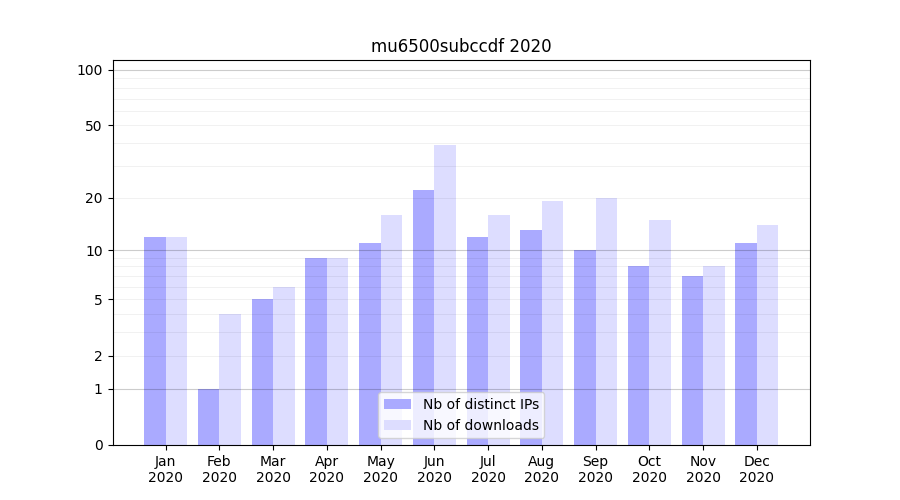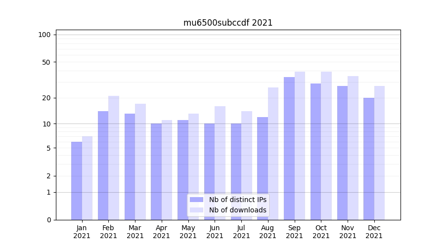 Number of downloads for annotation package mu6500subccdf, year by year, from 2025 back to 2014 (years with no downloads are omitted):