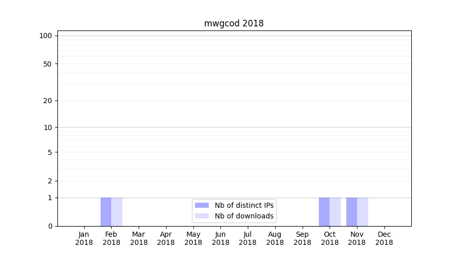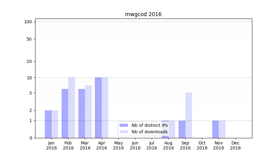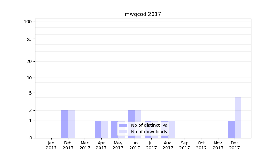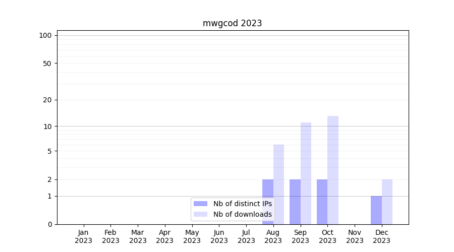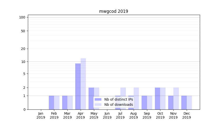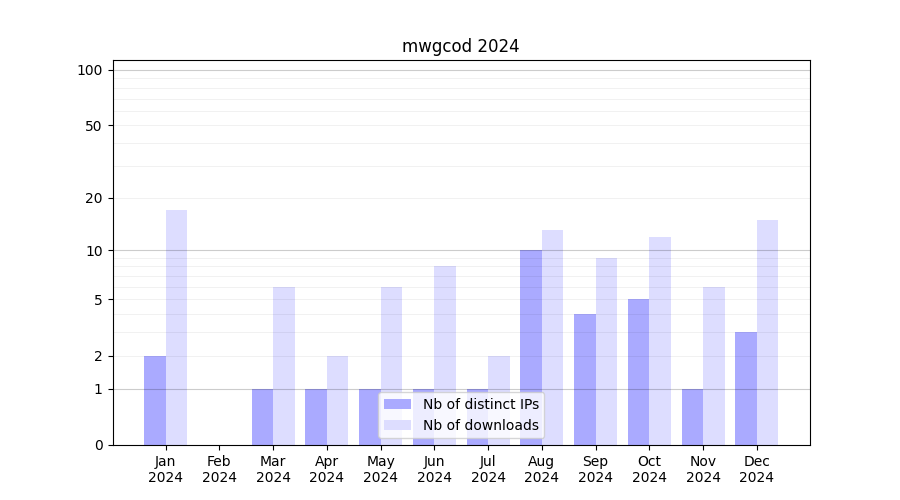 Number of downloads for annotation package mwgcod, year by year, from 2025 back to 2014 (years with no downloads are omitted):