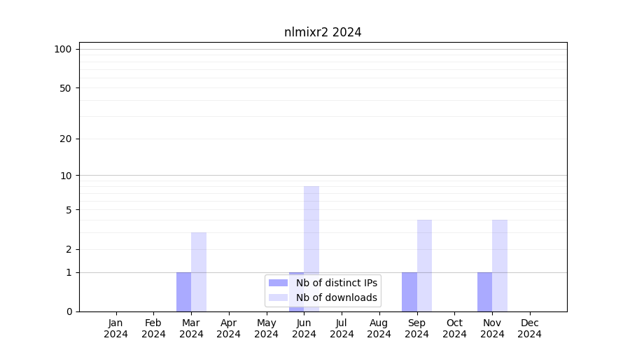 Number of downloads for annotation package nlmixr2, year by year, from 2025 back to 2014 (years with no downloads are omitted):