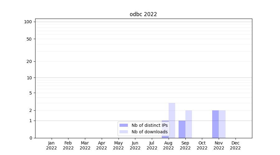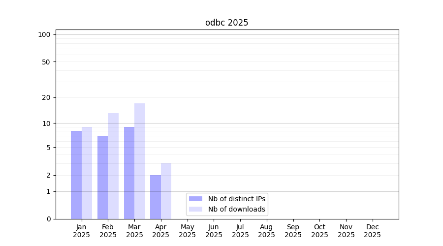 Number of downloads for annotation package odbc, year by year, from 2025 back to 2014 (years with no downloads are omitted):