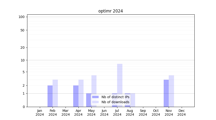 Number of downloads for annotation package optimr, year by year, from 2025 back to 2014 (years with no downloads are omitted):