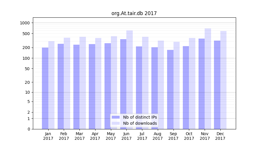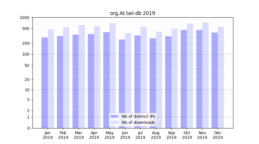 Number of downloads for annotation package org.At.tair.db, year by year, from 2025 back to 2014 (years with no downloads are omitted):