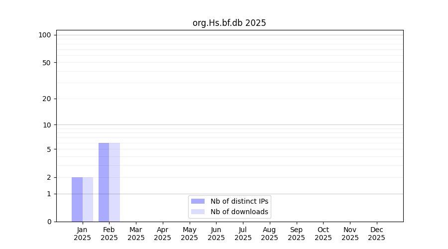 Number of downloads for annotation package org.Hs.bf.db, year by year, from 2025 back to 2014 (years with no downloads are omitted):