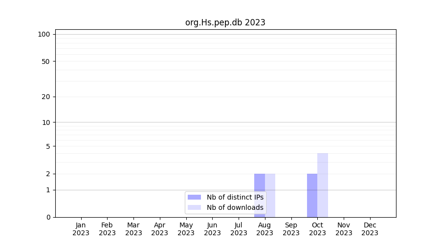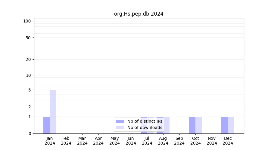 Number of downloads for annotation package org.Hs.pep.db, year by year, from 2025 back to 2014 (years with no downloads are omitted):