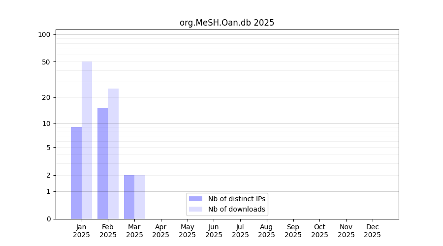 Number of downloads for annotation package org.MeSH.Oan.db, year by year, from 2025 back to 2014 (years with no downloads are omitted):