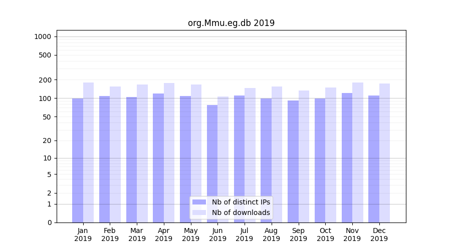 Number of downloads for annotation package org.Mmu.eg.db, year by year, from 2025 back to 2014 (years with no downloads are omitted):