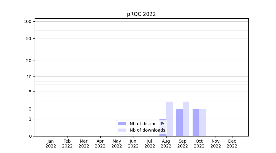 Number of downloads for annotation package pROC, year by year, from 2025 back to 2014 (years with no downloads are omitted):