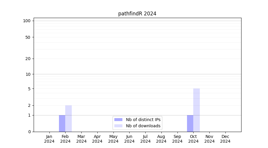 Number of downloads for annotation package pathfindR, year by year, from 2025 back to 2014 (years with no downloads are omitted):