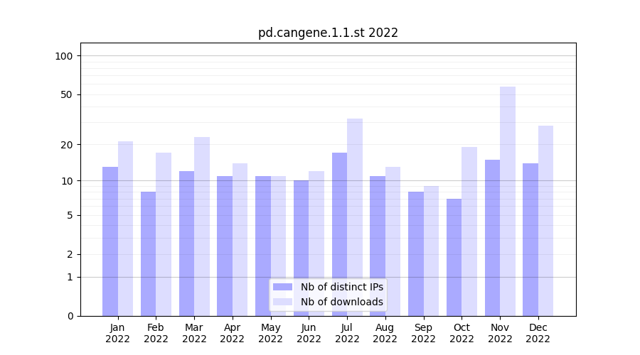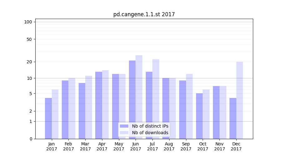 Number of downloads for annotation package pd.cangene.1.1.st, year by year, from 2025 back to 2014 (years with no downloads are omitted):