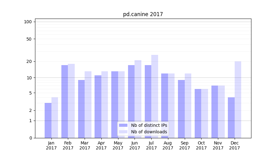 Number of downloads for annotation package pd.canine, year by year, from 2025 back to 2014 (years with no downloads are omitted):
