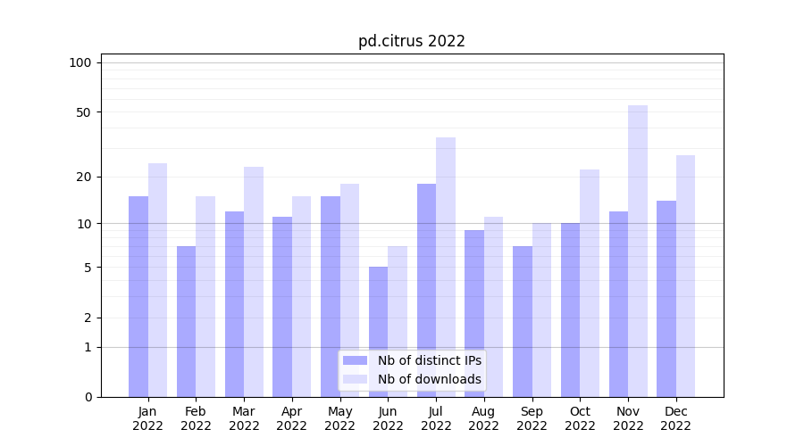 Number of downloads for annotation package pd.citrus, year by year, from 2025 back to 2014 (years with no downloads are omitted):