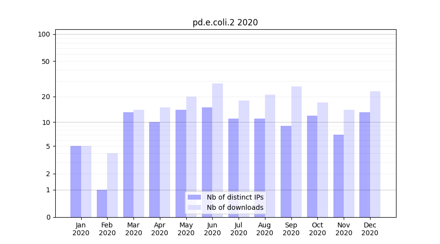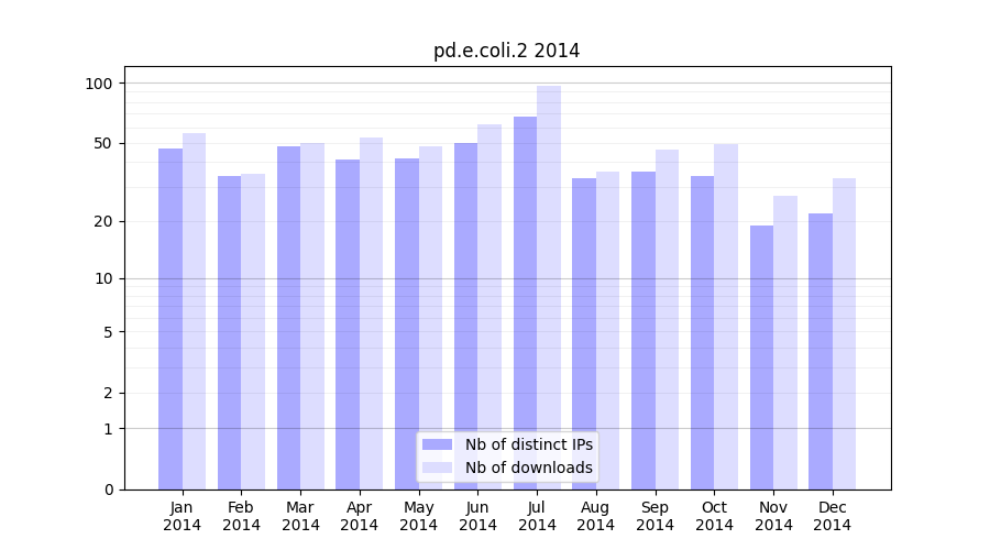 Number of downloads for annotation package pd.e.coli.2, year by year, from 2025 back to 2014 (years with no downloads are omitted):