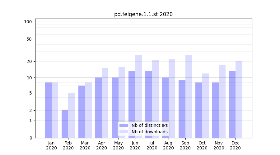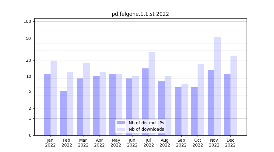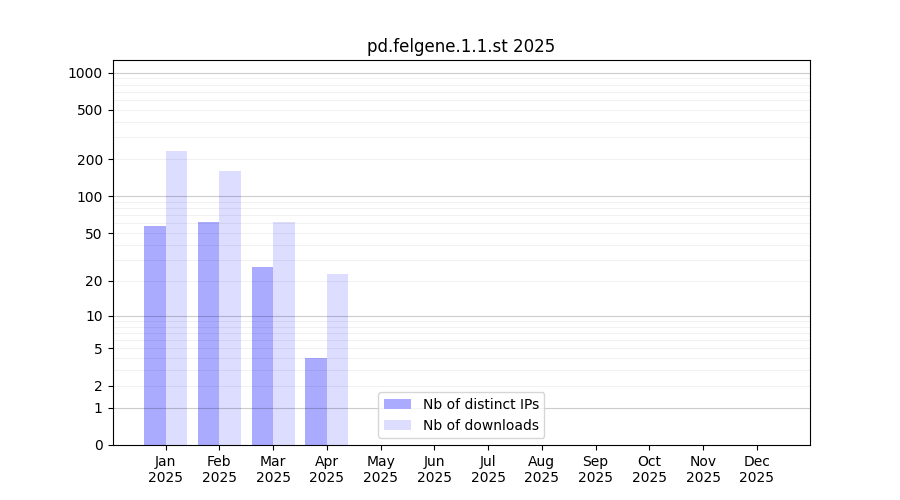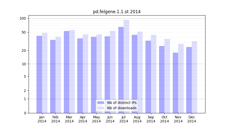 Number of downloads for annotation package pd.felgene.1.1.st, year by year, from 2025 back to 2014 (years with no downloads are omitted):