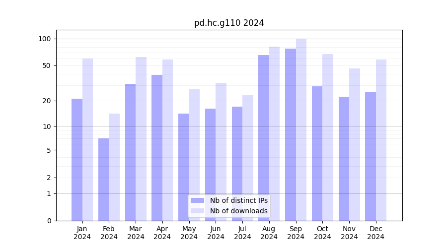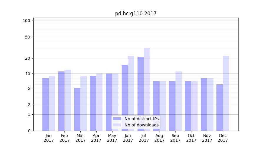 Number of downloads for annotation package pd.hc.g110, year by year, from 2025 back to 2014 (years with no downloads are omitted):