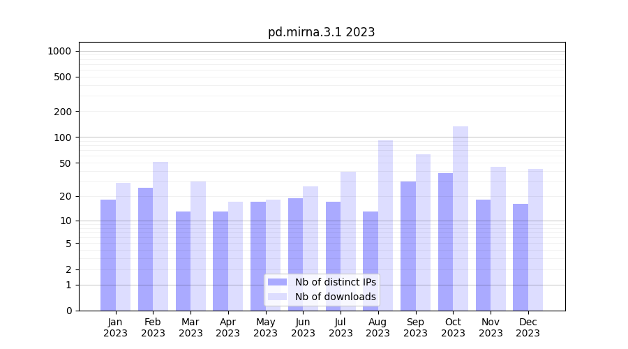 Number of downloads for annotation package pd.mirna.3.1, year by year, from 2025 back to 2014 (years with no downloads are omitted):