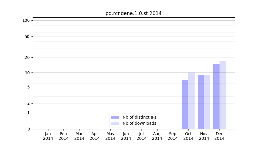 Number of downloads for annotation package pd.rcngene.1.0.st, year by year, from 2025 back to 2014 (years with no downloads are omitted):