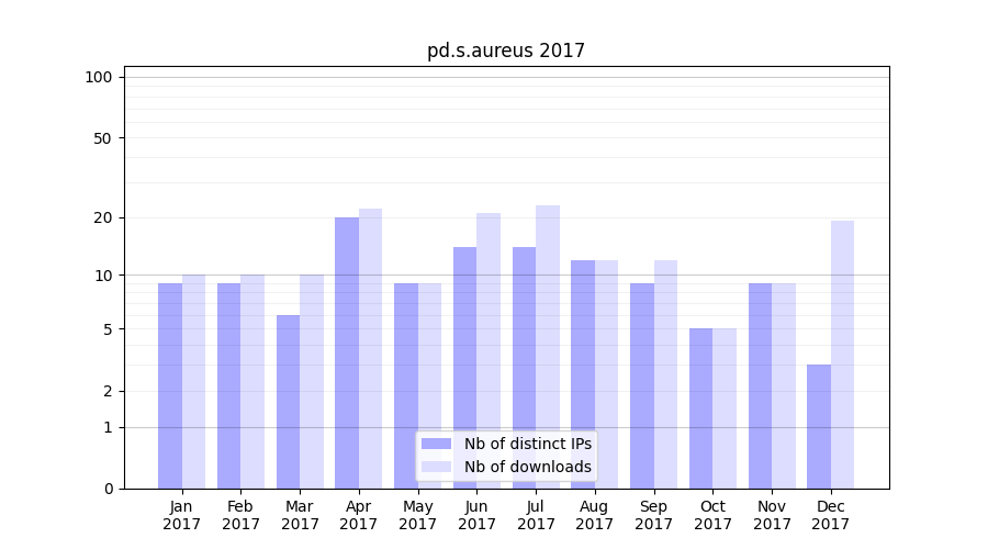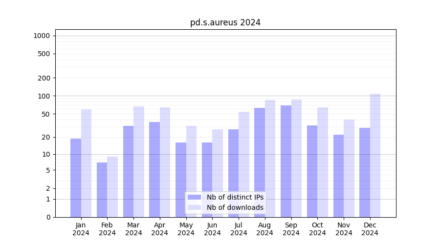 Number of downloads for annotation package pd.s.aureus, year by year, from 2025 back to 2014 (years with no downloads are omitted):