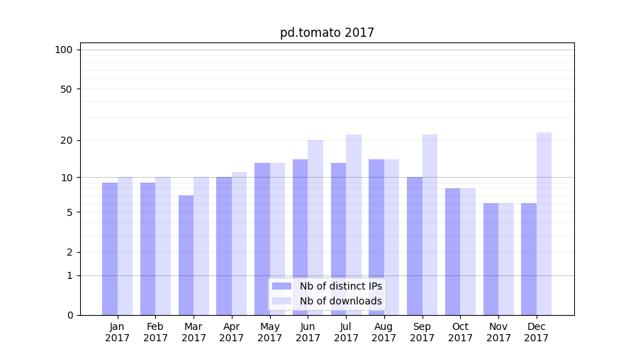 Number of downloads for annotation package pd.tomato, year by year, from 2025 back to 2014 (years with no downloads are omitted):