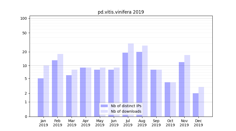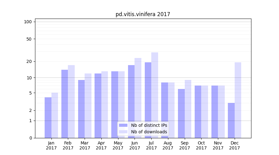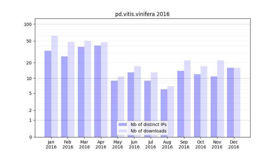 Number of downloads for annotation package pd.vitis.vinifera, year by year, from 2025 back to 2014 (years with no downloads are omitted):