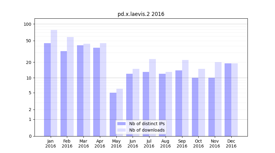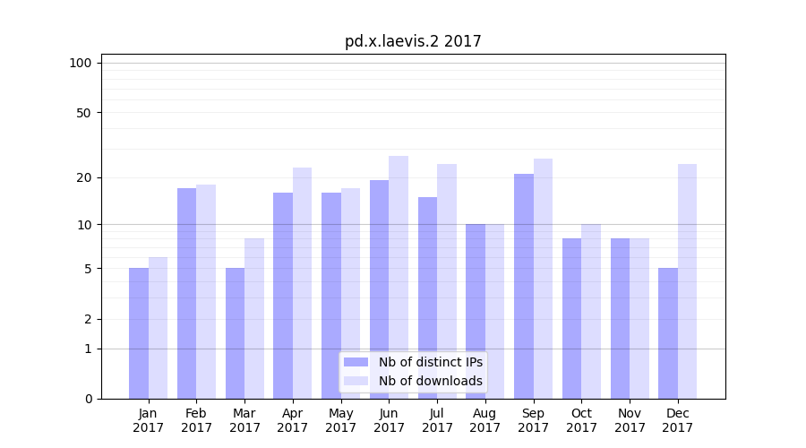 Number of downloads for annotation package pd.x.laevis.2, year by year, from 2025 back to 2014 (years with no downloads are omitted):