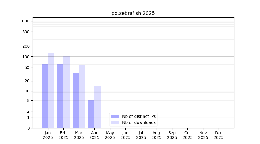 Number of downloads for annotation package pd.zebrafish, year by year, from 2025 back to 2014 (years with no downloads are omitted):