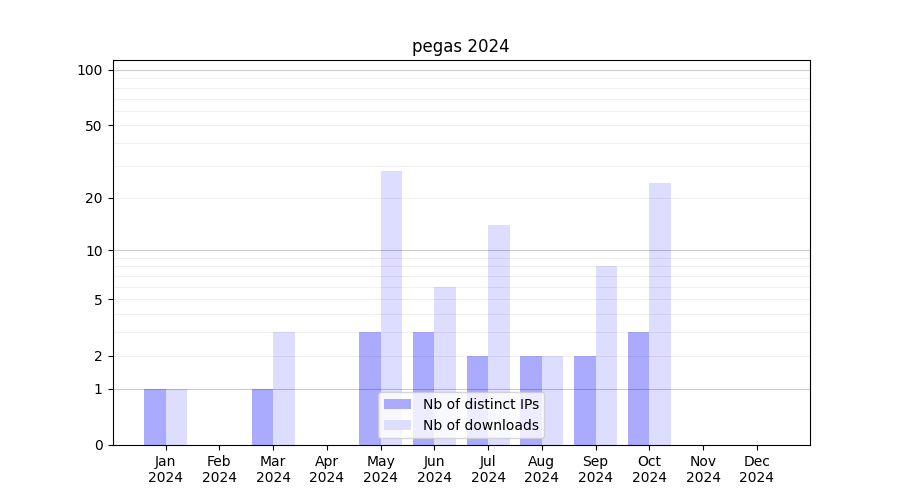 Number of downloads for annotation package pegas, year by year, from 2025 back to 2014 (years with no downloads are omitted):