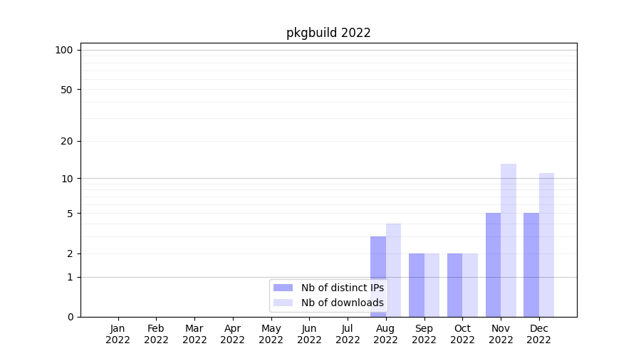 Number of downloads for annotation package pkgbuild, year by year, from 2025 back to 2014 (years with no downloads are omitted):
